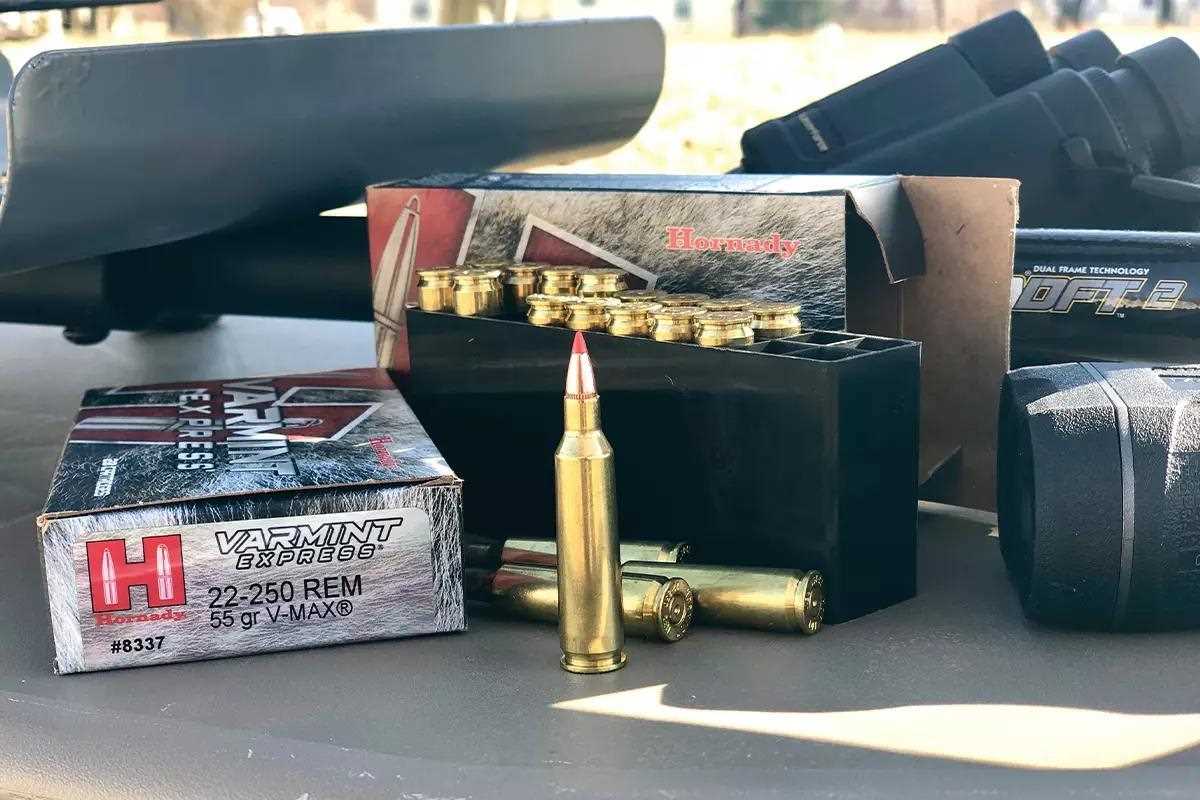 Lethal Load: A favorite load is Hornady ’s Varmint Express .22-250 Rem ., which uses a rapidly fragmenting 50-grain V-Max bullet. It’s accurate, fairly affordable, and has consistently dropped coyotes for me from 50 to 200 yards with little to no pelt damage.